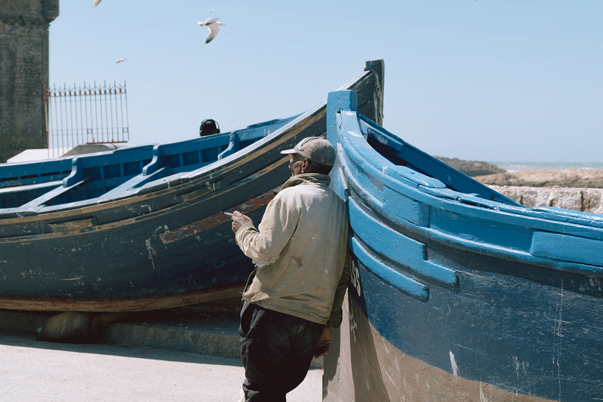 À l’heure où la brise de terre change de sens pour se transformer en brise de mer, une nuée d’embarcations afflue du grand large, se dandinant de part et d’autre de l’île de Mogador pour rejoindre la rade d’Essaouira. Un ballet ton sur ton, tant les barques bleues emblématiques de la cité se confondent avec les flots azur. Seuls les chalutiers se démarquent, par leurs couleurs et leur envergure. L’horloge affiche 8h30, le point de départ idéal pour visiter Essaouira en un jour. Le soleil s’est levé bien avant vous et les pêcheurs avant lui encore. Aussi, les étals de la criée sont déjà bien achalandés lorsque vous entreprenez une visite. Ambiance locale garantie, aussi bien par une bande son comportant son lot de tractations enthousiastes que par un capiteux fumet de poissons qui ne quitte bientôt plus vos narines. Maquereaux, sardines, anchois, chinchards… Les prises de la nuit sont présentées à même le sol en de grandes compositions artistiques mêlant écailles, filets et chats errants. Si le vôtre est déjà un lointain souvenir, le petit déjeuner des mouettes est servi sous forme de buffet virevoltant.