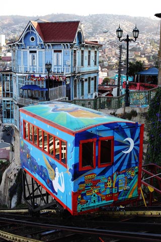 La ville est multicolore, elle monte, elle descend, offrant des perspectives variées, ses maisons côte à côte forment un enchevêtrement de petits cubes acidulés, on aime à se perdre dans ses ruelles. Ses ascenseurs urbains nous hissent vers le haut des collines, et on peut redescendre, tranquille, vers le port, ou peut-être un gros lion de mer nous accueillera nonchalamment, vautré sur une bouée. Car c'est bien vers la mer que Valparaiso est tournée.