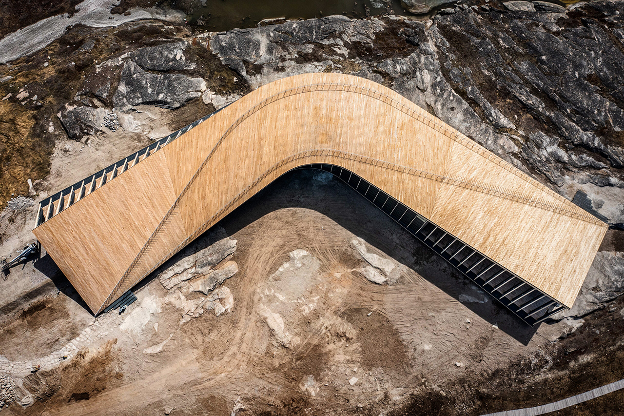 Les lignes de crêtes, la forme des glaciers, celle des congères de neige ou de la faune marine dictent leur coup de crayon. À l’image des projets de la Danoise Dorte Mandrup, parmi lesquels l’Icefjord Centre Ilulissat, au Groenland ; The Whale, centre culturel bâti sur Andøya et dédié aux baleines ; l’hôtel arctique Norrøna sur Senja, une autre île de Norvège (ouverture prévue en 2026) ou encore le futur Centre du patrimoine inuit d’Iqaluit dans le Nunavut canadien (2027). Des architectes qui dialoguent avec l’environnement polaire fragile et font preuve d’une reconnaissance envers les cultures vernaculaires trop longtemps ignorées. Un hommage tant sur le fond – la Galerie Nationale du Groenland imaginée par Bjarke Ingels Group –que sur la forme – avec, entre autres, le futur Musée arctique de Tromsø, en Norvège, conçu par le studio Henning Larsen, dont la base en ardoise et les volumes translucides évoquant les lanternes flottantes rappellent les lávvu, ces habitations traditionnelles du peuple sami.