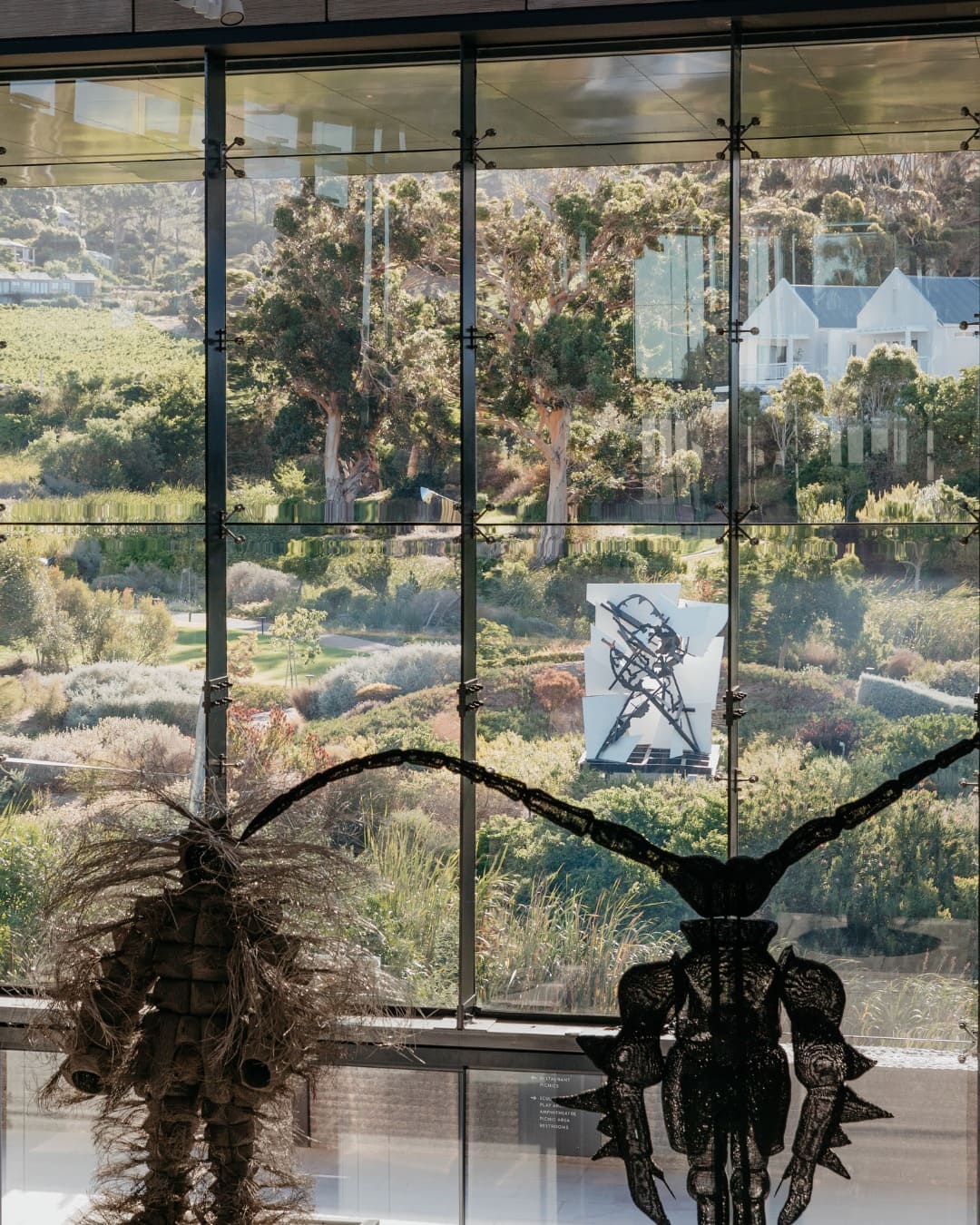 Le Dylan Lewis Sculpture Gardeen s’étend sur plusieurs hectares au pied des montagnes des Winelands. Le jardin mêle fynbos, aloès, restios, graminées et arbres méditerranéens, dessinant un paysage où les teintes évoluent naturellement, du vert profond des sous-bois au gris acier et à l’ocre des zones ouvertes. L’ensemble est structuré par des sentiers de pierre qui traversent des bosquets denses et des clairières, dévoilant des vues dégagées sur les collines environnantes. Les sculptures de Dylan Lewis, en bronze et en acier patiné, sont installées en dialogue direct avec le relief et la végétation. Leurs surfaces oxydées contrastent avec les masses végétales et se transforment selon la lumière, souvent franche et rasante. Inspirées de la faune, de figures mythologiques et de formes organiques, les œuvres s’intègrent sans artifices scénographiques, laissant au jardin un rôle central. La qualité paysagère du site structure l’expérience de visite et permet une lecture claire des œuvres dans un environnement naturel exceptionnel.