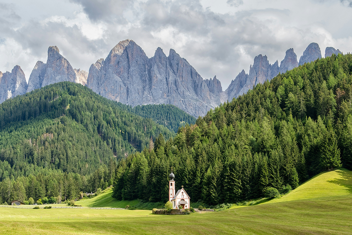 Un village minuscule, un paysage immense. Une localité agricole, préservée, où le temps semble suspendu – à peine quelques maisons regroupées autour d’une église au clocher pointu – et des prairies en pente douce, des forêts profondes, avec en toile de fond les aiguilles déchiquetées du massif des Odle. La petite église de Santa Maddalena devant les cimes acérées des Odle constitue aussi une des images emblématiques des Dolomites.