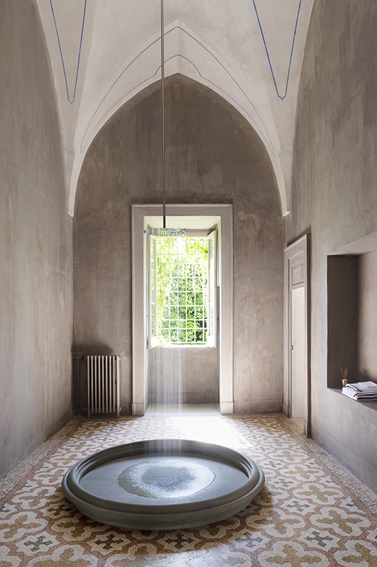 En plein cœur de cette petite commune d’environ 5 000 habitants, derrière la porte cochère, on ne se doute pas de la splendeur du bâtiment datant de 1861. Le Palazzo Daniele est encore habité par son propriétaire Francesco Petrucci, qui après avoir vécu partout dans le monde, a décidé de se retirer (à 30 ans) dans la maison familiale construite par les grands-parents de son grand-père maternel pour y organiser un Festival d’art contemporain, Capo d’Arte, et de l’ouvrir à une résidence d’artistes, aujourd’hui annexe de la villa Médicis. “Deux artistes de la Villa viennent ici en résidence pendant un mois laissant au passage des œuvres comme celles de Nicolas Party, Mohamed Namou, Tea Jorjadze, Roberto Cuoghi ou encore Nicola Martini”, évoque le jeune homme. Après avoir racheté une aile, puis l’autre, il s’attaque – avec l’architecte Ludovica Serafini (studio Palomba Serafini Associati) – à la rénovation du lieu, avec la volonté de rendre cet endroit contemporain, tout en gardant son esprit, son goût, sa mémoire et son passé. “On a vidé la partie historiquement habitée, qui était surchargée et sur-meublée. Les quatre canapés, les douze fauteuils, les quatre consoles, les quatre appliques et quatre rideaux sont partis. On a vidé les salons et les chambres pour mettre en avant la sacralité de cette absence, la sacralité de cet espace majestueux vide pour faire ressortir son histoire”, insiste Francesco Petrucci, en s’extasiant sur les fresques centenaires et les mosaïques au sol parfaitement restaurées. Thierry cherchait une maison dans la région et il est arrivé chez moi. Puisque je m’intéresse beaucoup au concept de l’éphémère, nous nous sommes tout de suite bien entendus, et il a décidé de me la louer pour deux mois pour ses hôtes de 700 000 heures”. Et voilà comment ce petit monde cohabite depuis quelques jours.