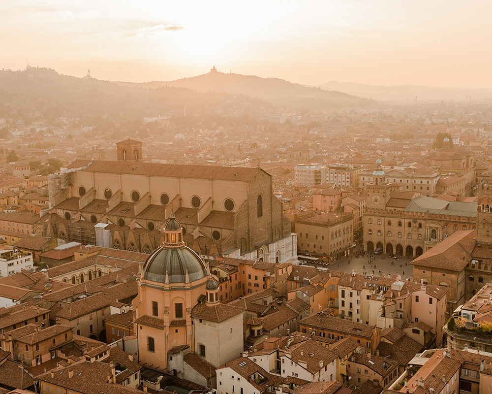 Par chance, on rejoint rapidement une autre épicurienne. Généreuse, voluptueuse, alléchante, Bologne ne fait pas dans la modération, et l’on ne parle pas ici uniquement de mortadella e tortellini. Le long des portici, historiques rues à arcades du centre médiéval, on se repaît de maisons de briques pleines de charme, de palais et de tours. Devant la San Petronio, basilique gothique de la piazza Maggiore, on ne peut qu’admettre le triomphe de l’éclectisme architectural bolognais. “Trois choses concourent à créer la beauté : d’abord l’intégrité ou perfection (…) ; ensuite, la proportion requise, autrement dit l’harmonie ; enfin, la clarté et la lumière…”.