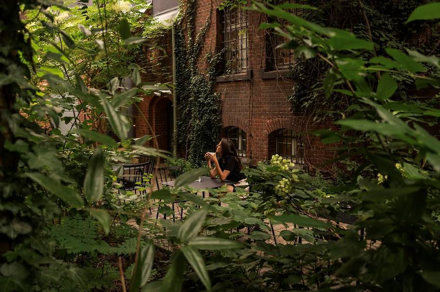 Dès votre arrivée, direction Berlin-Ouest, cette ancienne zone contrôlée par les Alliés dont le caractère ultra permissif et les bas loyers ont attiré artistes et musiciens, donnant naissance à une véritable culture underground. Votre adresse est caractéristique de ce renouveau à la berlinoise : ses murs sont ceux d’anciens édifices publics du XIXe siècle ayant fait l’objet d’importantes rénovations par un cabinet d’architecture allemand. L’entrée se fait via un ancien palais de justice aux airs de castel avant de rejoindre, par une extension de briques rouges, une ancienne prison pour femmes. Du style carcéral, quelques caractéristiques demeurent, comme le grand escalier autour duquel s’articulent des chambres. Pour le reste, l’impression d’ensemble est celle d’un cocon ensoleillé ceint de verdure. Accolés au jardin, le restaurant et le bar accueillent sous de belles voûtes les visiteurs en quête de saveurs traditionnelles revisitées et d’une atmosphère feutrée. Pour un autre moment délicieux, direction le rooftop où trône la piscine extérieure, ouverte en saison.