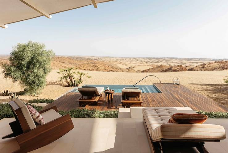 Route pour le désert du Hedjaz. Installation pour deux nuits dans un complexe qui s'articule autour d'un centre commun circulaire couvert et d'une petite oasis regroupant piscine, cafés et restaurants. Votre villa, abritée sous un auvent angulaire, s'inspire des teintes et de l'atmosphère du désert. L'intérieur se distingue par des courbes rappelant les dunes et par un mobilier artisanal orné de tapis et tissus traditionnels bédouins. La salle de bains est un sanctuaire de détente, avec des surfaces tactiles, une douche spacieuse et une baignoire profonde. En journée, il est facile de passer tout son temps dans le spa souterrain se déployant sur près de 4 000 mètres carrés. Salles de soins, ainsi qu'un espace vitalité avec sauna, hammam, sauna infrarouge et bain froid prodiguent bien-être et fraîcheur. Pour les âmes d’aventuriers, des sentiers de randonnée partent du complexe et rayonnent à travers les dunes accidentées, les falaises escarpées et les vestiges archéologiques. Le soir venu, apéritifs et dîners se savourent au restaurant gastronomique. L'endroit est idéal pour admirer les couchers de soleil aux teintes rosées et orangées.