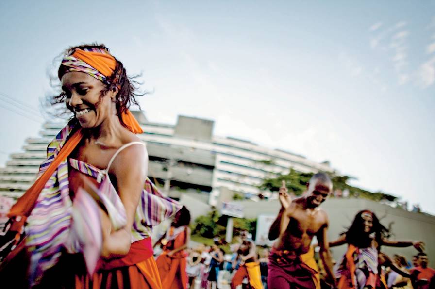 Au programme – Journée dans le Pelourinho et la ville basse de Salvador, en privé. En compagnie d'un guide, vous partez explorer la péninsule d'Itapagipe – ou "ville basse" – où se trouvent les quartiers populaires établis le long de la mer. C'est là que bat le cœur de la vie traditionnelle bahianaise : la Feira de São Joaquim, le plus grand marché de la ville. On y trouve tous les fruits et les saveurs de cette terre tropicale. On visite également l'église de Bonfim, symbiose entre rite catholique et croyances en les orixás africains ; le fort de Monte Serrat à l'entrée de la baie ; et le très typique quartier de pêcheurs de Pedra Furada, avec ses restaurants de crabes et de poissons, ses points de vue imprenables sur toute la baie et ses concerts. Quant au Pelourinho, cœur historique de Salvador que vous arpentez à pied, il s'agit du plus grand ensemble colonial baroque du pays (XVIIe et XVIIIe) – innombrables églises, praça da Sé, terreiro de Jesus, maison de l'écrivain Jorge Amado, place Tomé de Souza, fondateur de la cité... Sans oublier le majestueux palais de Rio Branco, aux intérieurs Belle Époque. Construit 70 mètres au-dessus de la mer, l'édifice surplombe la baie de Todos os Santos. Une balade extrêmement riche le long de bâtiments aux murs patinés. Et surtout une mine d'informations sur l'héritage des descendants d'esclaves et le syncrétisme religieux rappelant le métissage de cette terre qui fit jadis la richesse du Portugal.