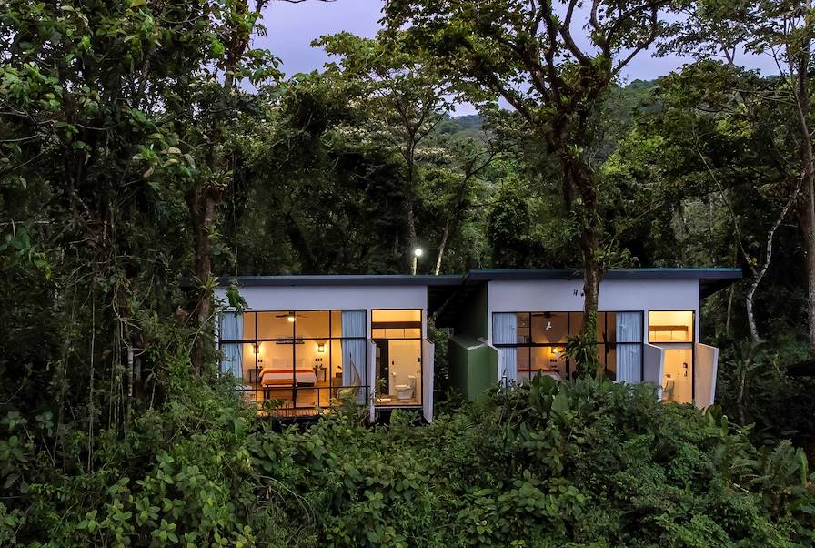 À l'arrivée à Caño Negro, installation pour deux nuits au sein d'un camp de glamping organisé autour d'un point d'eau. Votre "tente" ne mesure pas moins de 50 m² ! Une superficie qui permet d'accueillir un lit XXL encadré de jolis luminaires, un canapé, une salle de bains avec double évier en pierre... À l'extérieur, à votre disposition exclusive, se trouvent également une baignoire, une douche et un hamac promettant de délicieuses siestes. Avec tout cela, peu de risque que vous souhaitiez sortir. Manquer les espaces communs serait pourtant dommage : le restaurant, ouvert sur la nature, sert une cuisine aux accents locaux préparée à base d'ingrédients sourcés au plus près. Et en soirée, on peut rejoindre le lounge pour un cocktail ou les braseros pour débriefer au coin du feu.