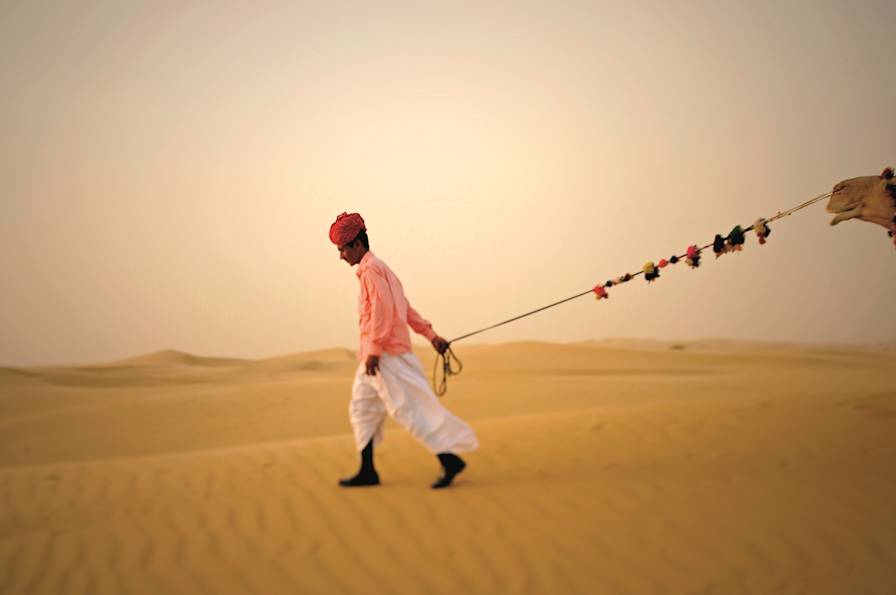 Il faut prendre des forces pour la route. Ne snobez pas la délicieuse omelette Masala et le porridge très british que le personnel de l’hôtel vous a préparés en cuisine. Pour gagner Rohet en effet, il faut compter une petite journée de route. Une longue portion de trajet donc, à travers les vastes étendues semi-arides du Rajsthan, mais à l’arrivée aux abords du lac qui abreuve le village, quel enchantement ! Au sud de Jodhpur, ce petit village du Rajasthan dévoile un visage traditionnel de l’Inde. On observe ici des techniques agricoles ancestrales. On est invité, parfois, à pénétrer au sein des maisons des villageois, des hommes en turban et des femmes à la peau caramel, tannée par le travail de la terre. En plein cœur du désert du Thar, installation pour une nuit dans un magnifique château reconverti, vieux de 350 ans, perché votre adresse est perchée au sommet d'une dune ; une très belle propriété aux couleurs de sable inspirée de l’architecture rurale de l’ouest du Rajasthan - murs enduits à la chaux, décorés de jolies fresques colorées, angles doux, alcôves et cheminées. L’inspiration, l’aménagement, le mobilier et les objets qui l’habitent viennent tous de la région. Les intérieurs déclinent les couleurs, les motifs des portes, les têtes de lits sculptées et les manteaux de cheminée en pierre incrustée de petits miroirs rajasthani. D’épais tapis tissés à plat selon la tradition des « dhurries » réchauffent les sols. Le dîner est servi sous les arbres autour de la piscine, mais vous pouvez demander que l’on vous dresse une table sur la terrasse qui surplombe le lac.