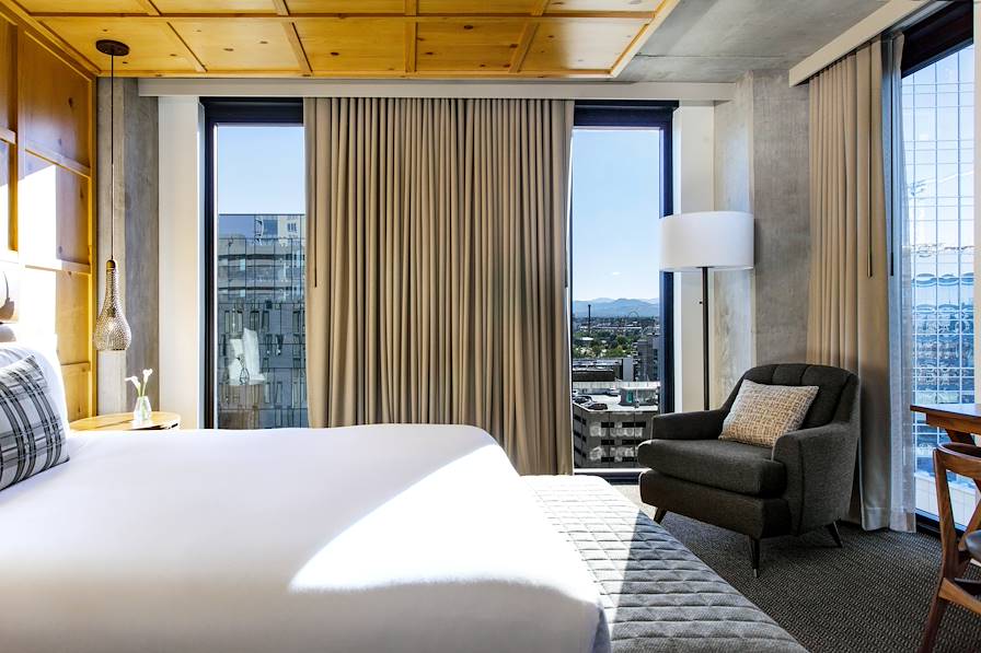 Route pour Colorado Springs et installation pour la nuit dans un hôtel simple mais dans l'air du temps – brique apparente, fauteuils vintage, plantes et meubles chinés. Les espaces sont conviviaux et accueillants ; les chambres confortables.