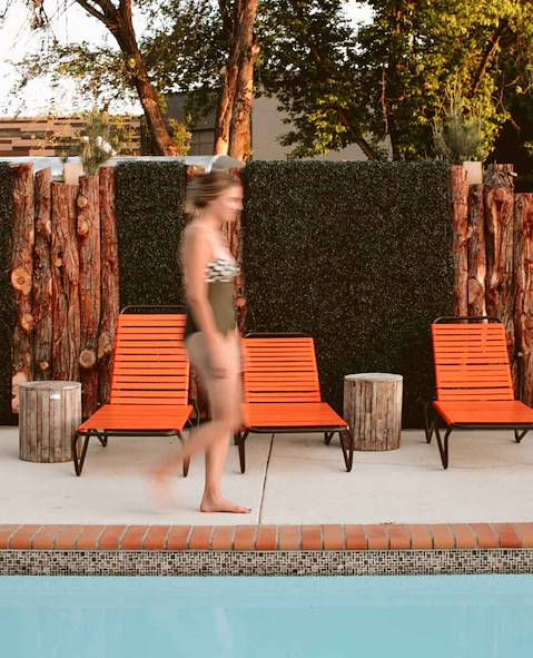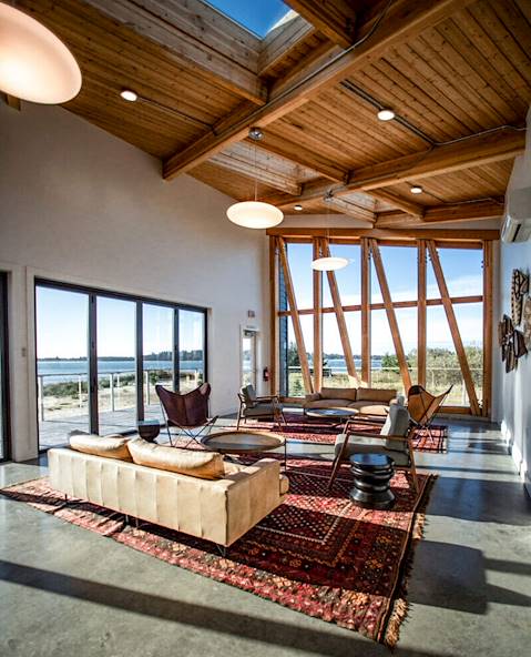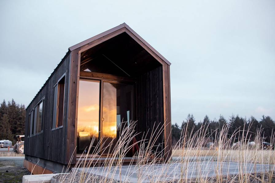 Poursuite de la route jusqu'à Coos Bay et installation pour deux nuits dans une jolie maisonnette en bois tout en longueur annonçant une expérience glamping pleine de confort. À l'intérieur, chambre, salle de bains, kitchenette et coin salon ouvert sur l'extérieur par une grande baie vitrée. La déco, épurée, évoque la tendance scandinave. À quelques pas, une belle piscine intérieure et un espace lounge très joliment agencé.