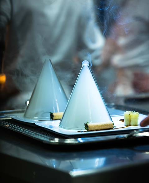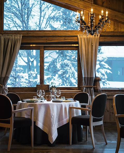 Vous investissez une élégante adresse Relais & Châteaux, un beau chalet savoyard bardé de confort, décor montagnard rêvé au bois patiné qui, s'il pouvait parler, aurait certainement beaucoup à raconter. Ici et là, cloches, poteries, lainages et autres fourches à foin – souvenirs de famille ou trouvailles – confèrent au lieu beaucoup de charme et de vie. Aux heures ensoleillées, on bulle sur son balcon, un plaid sur les jambes, absorbé par la montagne enneigée. Le soir, on se love dans l'un des fauteuil moelleux du bar ou l'on rejoint le spa qui met définitivement à l'abri du froid – sauna au foin, hammam aux agrumes, soins au laits et herbes aromatiques... Mais l’histoire des lieux s’est avant tout écrite côté table. Aux raclettes et fondues des jeunes années ont succédés des plats plus travaillés, fruits de l’imagination et du travail du père et du fils, tous deux chefs autodidactes. Une cuisine toujours inspirée des produits du terroir, déclinant des interprétations raffinées accompagnées de leurs vins d’altitude. Jusqu’à la consécration, il y a quelques années, avec une troisième étoile Michelin.
