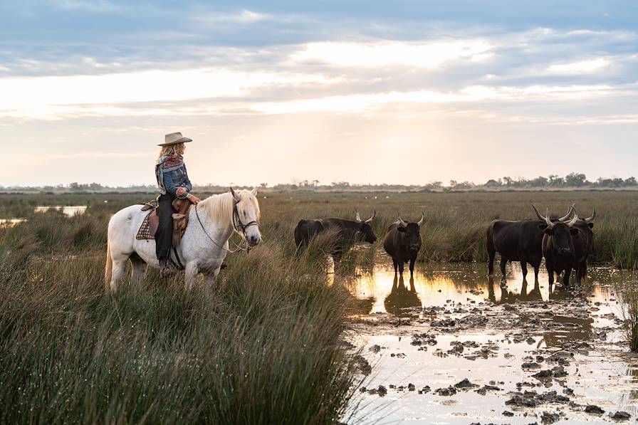 Au programme - Safari à travers la Camargue. À bord d'un véhicule tout terrain, accompagnés d'un guide-chauffeur connaissant les lieux comme sa poche, vous partez à l'assaut des paysages sauvages de la Camargue. Loin des circuits classiques, vous suivrez peut-être une manade, troupeau libre de chevaux ou de taureaux, tandis que votre acolyte partage avec vous les spécificités du métier de gardian, au cœur du mode de vie traditionnel camarguais. Une halte est ensuite prévue dans ce cadre naturel privilégié pour déguster quelques spécialités et vins régionaux.