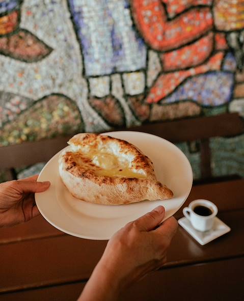 Dans l'assiette - khatchapouri, pain en forme de bateau rempli de formage fondu, de beurre et surmonté d'un œuf ; kharcho, ragoût à base de bœuf et de noix ; khinkali, gros ravioli farci à la viande qui se mange traditionnellement à la main et en une seule bouchée (il contient généralement du bouillon, le couper reviendrait à perdre ce précieux liquide) en le tenant par le haut, appelé kudi ; lobiani, tourte salée aux haricots ; soko ketse, champignons farcis de fromage sulguni et gratinés au four dans un plat en terre cuite ; lobio, ragoût de haricots ; pkhali, salade/tartinade à base d'épinard, betterave et/ou chou cuits, ail, herbes et noix souvent accompagnée de pain de maïs ou mchadi ; ajapsandali, plat cousin de la ratatouille préparé à base de tomates, aubergines et poivrons ; kubdari, tourte de viande épicée ; kuchmachi, plat à base d'abats cuisinés aux herbes aromatiques et parsemés de graines de grenade ; elarji, régressive bouillie de farine et semoule de maïs dans lesquelles on fait fondre du fromage ; kupati, saucisse de porc ou de bœuf assaisonnée aux poivre, ail, cannelle et autres épices ; churchkhela, douceur en forme de bougie préparée avec des noix ou noisettes enrobées de jus de raisin épaissi ; medok, gâteau composé de plusieurs couches successives de génoise, miel, noix et crème ; gozinaki, dessert de fête au miel et aux noix. Dans le verre - plus de cinq cents cépages différents : des rouges charpentés (saperavi, mujuretuli), des blancs subtils (rkhatsiteli, mtsvane), mais aussi ces fameux vins orange, vinifiés en qvevri, jarres de terre cuite rappelant les amphores antiques. La Géorgie, considérée par beaucoup comme le berceau du vin, en produit depuis pas moins de 8000 ans.