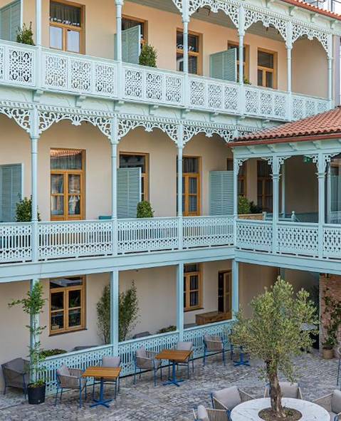 Transfert privé et installation pour trois nuits dans une maison ancienne joliment restaurée. Les galeries bleues sur la cour notamment, finement ouvragées. À l’intérieur, un certain classicisme arty qu’animent les peintures murales de Musya Qeburya. Et une atmosphère voyage Belle Époque. Le penchant design se manifeste un peu partout. Votre chambre est parfaitement équipée et confortable ; elle possède un esprit. Le restaurant modernise la tradition géorgienne avec talent et savoir-faire. Le résultat est tout à fait convaincant et peut établir les codes de la cuisine d'aujourd'hui à Tbilissi. Au bar, on vous prépare des cocktails tout à fait dignes de ce nom. Lorsque le temps le permet, on en profite dans la cour.