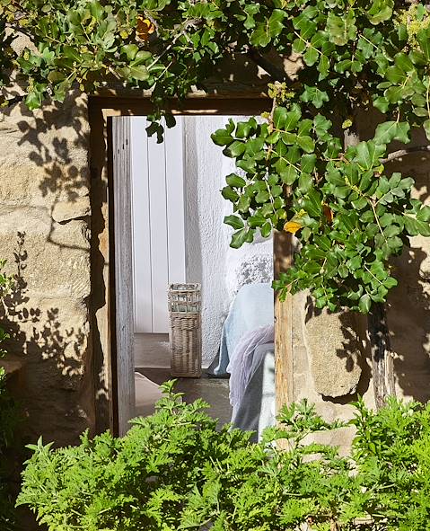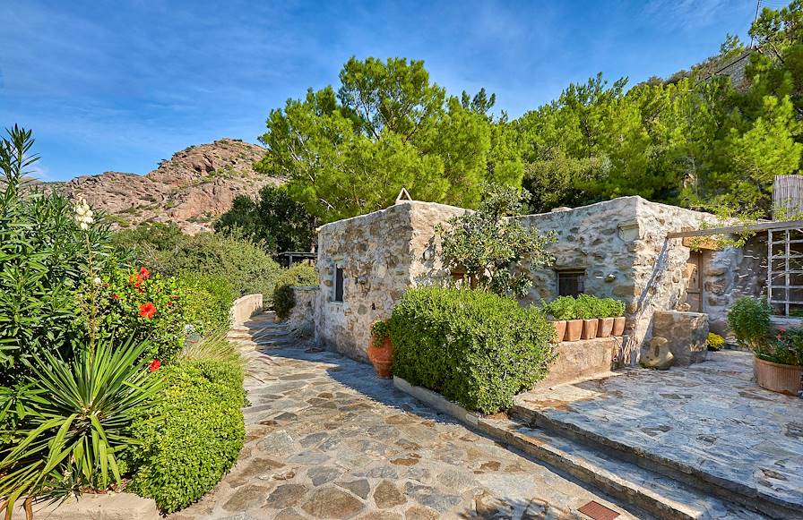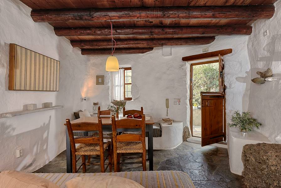 À l'arrivée à Makrigialos, installation pour quatre nuits dans un cottage situé à tout juste un kilomètre du village, dans les terres. Succombant au charme de ces anciennes maisons crétoises, le propriétaire les a restaurées dans le respect des traditions et avec un goût sûr, pour en faire de confortables petites bâtisses à l'atmosphère volontairement rustique, certaines étant même construites à flanc de rocher. Le choix est allé à la simplicité et au minimalisme avec des tomettes au sol, des murs blanchis à la chaux, des poutres apparentes et des lits creusés dans la roche. À chaque maisonnette son jardin planté d’oliviers, de caroubiers, de pins et de cactus. On séjourne ici parfaitement au calme, bien loin des foules.