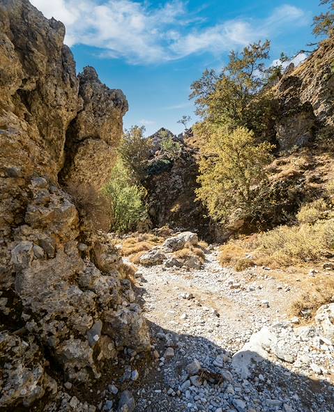 Au programme - Les gorges d'Imbros et le sud de La Canée, en privé. Avec un dénivelé de 650 mètres, les gorges d’Imbros sont tout aussi spectaculaires que celles de Samaria – et peu fréquentées ! Elles serpentent sur près de 8 km au fil de chemins très praticables où il est possible d'admirer orchidées, amandiers et lauriers roses. Au fil du parcours libre, on longe des cascades de rochers et de nombreuses grottes, on admire un paysage changeant depuis la plaine fertile d'Askyfou jusqu'à l'extrémité rocheuse de la côte sud. À la fin du sentier, on rejoint par la route la forteresse de Frangokastelo. On profite ici d'un moment de détente et de baignade sur la plage, avant de déjeuner dans une taverne. La visite se termine par une balade dans le village de Chora Sfakion.