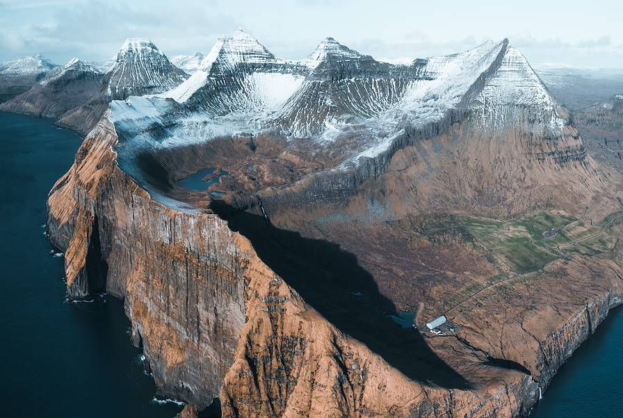 Vol direct pour les îles Féroé. À l'arrivée, prise en charge de la voiture de location et route pour l'île de Vágar où vous vous installez pour deux nuits. Votre hôtel se compose de quelques cottages discrets construits entièrement en bois. Coiffés d'une traditionnelle toiture végétale, ils disparaissent presque dans leur environnement, ce qui ne les empêche pas d'abriter tout le confort moderne. À l'intérieur, on retrouve du bois, une cuisine équipée et des assises moelleuses, délicieuse invitation à recharger ses batteries. Une fois reposé, on rejoint à pied certaines des merveilles naturelles des sauvages Féroé, escorté par des voisins enthousiastes : oiseaux, moutons et vaches Highland.