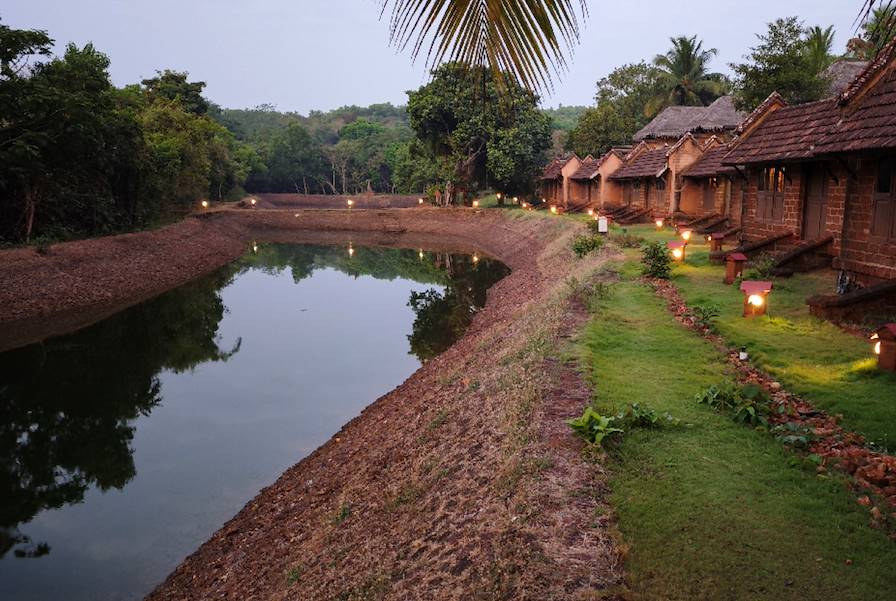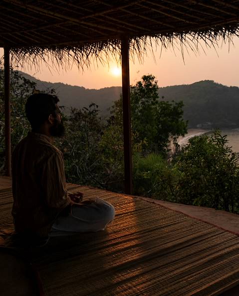Vous posez vos valises pour cinq nuits sur les rives de la mer d'Arabie, en surplomb d'une plage tranquille. Enveloppée par dix hectares de végétation, cette adresse ambitionne d'apaiser le corps et l’esprit. Aligné avec cet univers contemplatif, votre bungalow s'inspire de l'architecture traditionnelle konkani (pierre de latérite, chaume de coco). Les intérieurs, désencombrés, tirent également parti des matériaux naturels. Au niveau de la mer, un espace où pratiquer la détente en soirée. Au-dessus, un coin nuit apaisé et une salle de bain partiellement exposée au ciel. Tourné vers le ressourcement, le vaste menu d'activités de l'hôtel inclut la méditation, l'ayurvéda, la naturopathie ou encore le yoga. Et, bien sûr, des massages.
