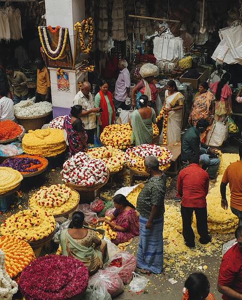 Au programme - La visite privée de Mysore. Lorsqu’en 1912, le maharadja de Mysore vit terminée sa nouvelle demeure, il dut certainement se féliciter d’avoir choisi l’architecte Henry Irwin pour la réaliser. Car il faut être le Taj Mahal pour attirer aujourd’hui plus de visiteurs que le majestueux Mysore Palace. Durant la visite, on gravit aussi les mille marches de Chamundi Hills, au sommet desquelles se dresse le temple Sri Chamundeswari, dédié à Shakti, consort de Shiva et déesse tutélaire des maharadjas locaux. À mi-pente, on rencontre d’ailleurs le vahana (monture de Shiva), le taureau Nandi, sculpté au XVIIe siècle dans un bloc de granit cyclopéen. De là-haut, le panorama est splendide. Au retour, promenade au marché.