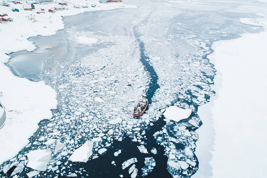 Au programme - Une croisière dans l'Isfjord, qui abrite le très actif glacier Sermeq Kujalleq. Chaque jour, d’énormes morceaux s’en détachent. Beaucoup ne flottent pas immédiatement mais s’échouent au fond de l’eau avant de remonter à la surface, au bout de plusieurs années, et d’entamer leur dérive sur les eaux polaires. Sous le soleil de minuit ou au coucher du soleil, les couleurs rougeoyantes se reflètent dans ces monstres de glace, un spectacle d’une fascinante lenteur.