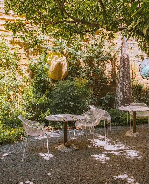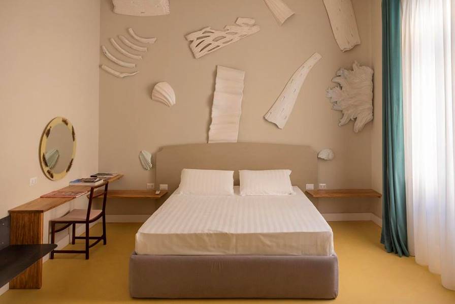 Transfert privé vers la gare et bref trajet pour Naples (1h). À mesure que l'on avance, le panorama se fait plus méridional, entre plaines ensoleillées et collines sèches. Puis les wagons glissent vers la baie dominée par la silhouette, imposante, du Vésuve. Installation pour deux nuits dans le Rione Sanità, juste au nord du centre historique de Naples. La maison, qui puise ses origines au XXe siècle, est enveloppée d'un ravissant jardin. L'adresse officie tout à la fois comme hôtel et atelier/galerie d'art/joaillerie. La décoration est un décor. D'une pièce à l'autre tout cela varie, crée de nouveaux équilibres, exploite de nouvelles palettes, formes et textures. Les chambres demeurent parfaitement équipées et confortables. Et tout est soigné dans le moindre détail.