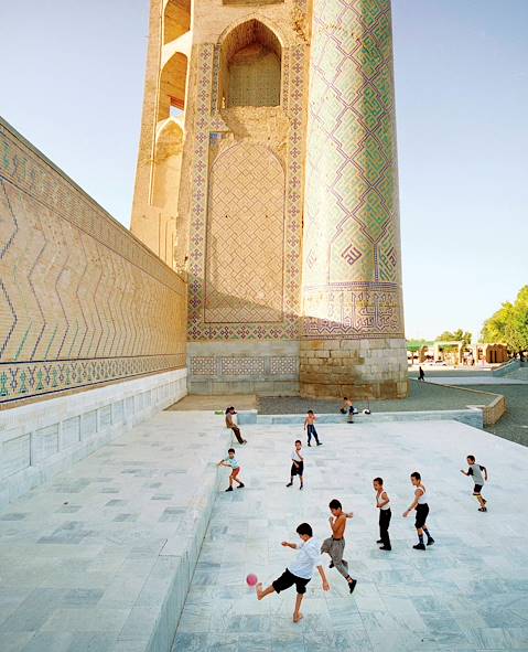 Déjà prévue - Visite privée du vieux Boukhara. Avec un guide francophone, revue de quelques-uns des plus beaux monuments historiques. L’Ark, la citadelle, est l’un d’eux. Édifiée au XVIe siècle par les mongols chaybanides, elle enferme à l’intérieur de ses remparts bombés une mosquée, une salle d’audience, des casernes, une trésorerie : tout le dispositif du pouvoir. En face, la forêt de colonnes à chapiteau polychrome de la mosquée Bolo Haouz et l’un des bassins qui ont fait l’agrément de la ville. Le mausolée des Samanides (IXe et Xe siècles) a été exhumé en 1934 et méticuleusement restauré. Au Po i Kalon se trouve la madrasa Mir i Arab, construite au XVIe siècle par le cheik soufi Abdoullah Yamani (elle put, seule parmi les écoles musulmanes boukhariotes, exercer sa fonction d’enseignement pendant la période soviétique) ; face à elle, la splendide mosquée (XVIe siècle et le minaret Kalon, du XIIe siècle, qui servit de roche Tarpéienne et de point de repère aux caravaniers. Dans les tâq, coupoles marchandes couvrant encore trois carrefours, le business n’a pas cessé depuis le XVIe siècle et, au besoin, les transactions se réalisent en euros. Pause thé de rigueur dans une choyxona.