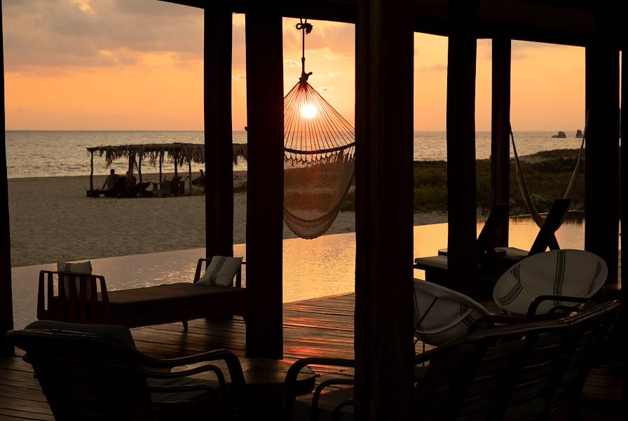Route pour l'aéroport de Guadalajara, restitution de la voiture et vol pour Puerto Escondido, sur la côte Pacifique. À l'arrivée, transfert privé et installation pour trois nuits sur la plage de la Barra de Colotepec, face à l'océan. Volonté de l'architecte ayant imaginé l'hôtel, des arches autorisent de belles hauteurs. Quant aux briques locales qui composent les murs, elles préservent une fraîcheur bienvenue dans la poignée de chambres. À l’intérieur, la part belle est faite aux matériaux locaux et naturels, et à la sérénité qui, partout, prédomine. Votre chambre, privilégiée, se prolonge par une piscine privée.