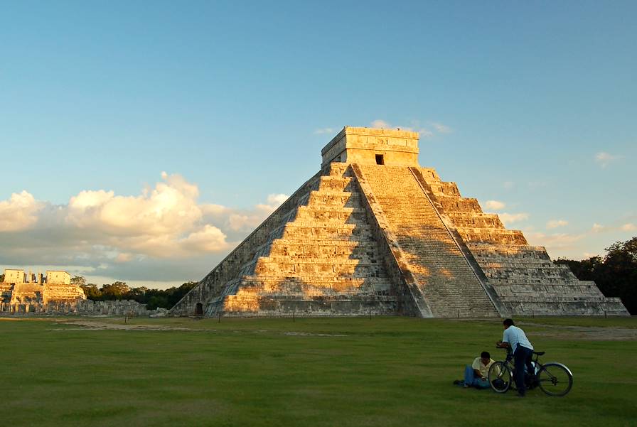Au programme - Chichén Itzá en privé. Ces jours-ci, on se déplace en voiture avec chauffeur. Et pour commencer, vous visitez avec un guide francophone privé l’une des plus fameuses cités du monde maya : Chichén Itzá. La pyramide de Kukulcán est tout particulièrement célèbre pour la rigueur et la sophistication astronomique de sa conception. Kukulcán, c’est le Serpent à plumes des Mayas, le Quetzalcoatl des Aztèques, le dieu-maïs qui a des feuilles-plumes et des grains-écailles. Aux solstices et aux équinoxes, il ondule sur les flancs de la pyramide.