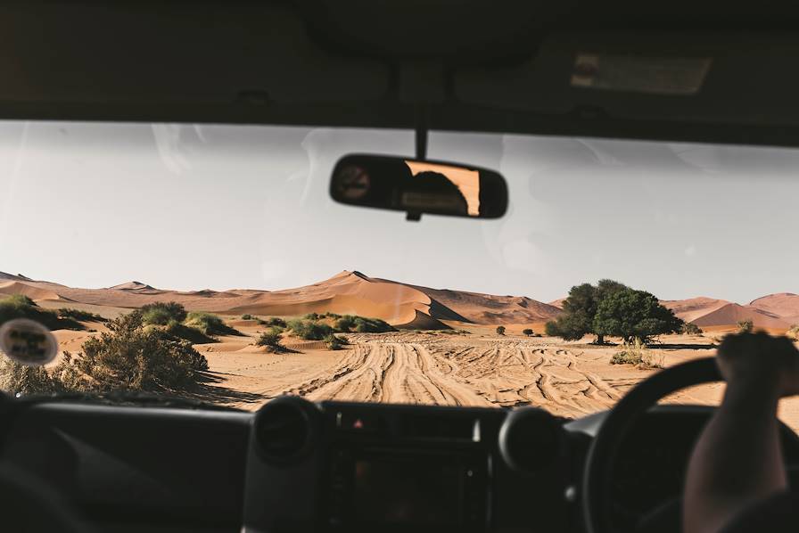Par Sesriem, on entre dans le Namib-Naukluft National Park, le plus étendu des parcs africains : 49 768 km², un peu plus grand que la Slovaquie. Hors frange atlantique, l’aridité y est générale, quasi absolue dans certaines zones. Faune et flore ont développé là des techniques de survie dont certains éléments intéressent les secteurs de pointe de l’industrie humaine. Si l’outarde de Rüppel vit normalement pour une outarde, l’oryx gazelle dispose d’un système de thermorégulation high-tech. Quant au coléoptère Stenocara gracilipes, son dispositif de captation de l’humidité de l’air intéresse les chercheurs du MIT. Le secteur de Sossusvlei, désert de sel dans le désert de sable, est fameux pour sa mer de dunes. Celles-ci, composées de sable orangé sur lequel la lumière joue magnifiquement, atteignent des hauteurs supérieures à 300 mètres. Les acacias, qui opèrent comme de véritables puits de forage, vont chercher l’eau à des dizaines de mètres de profondeur. Ce paysage hors normes est abordable sans grande difficulté.
