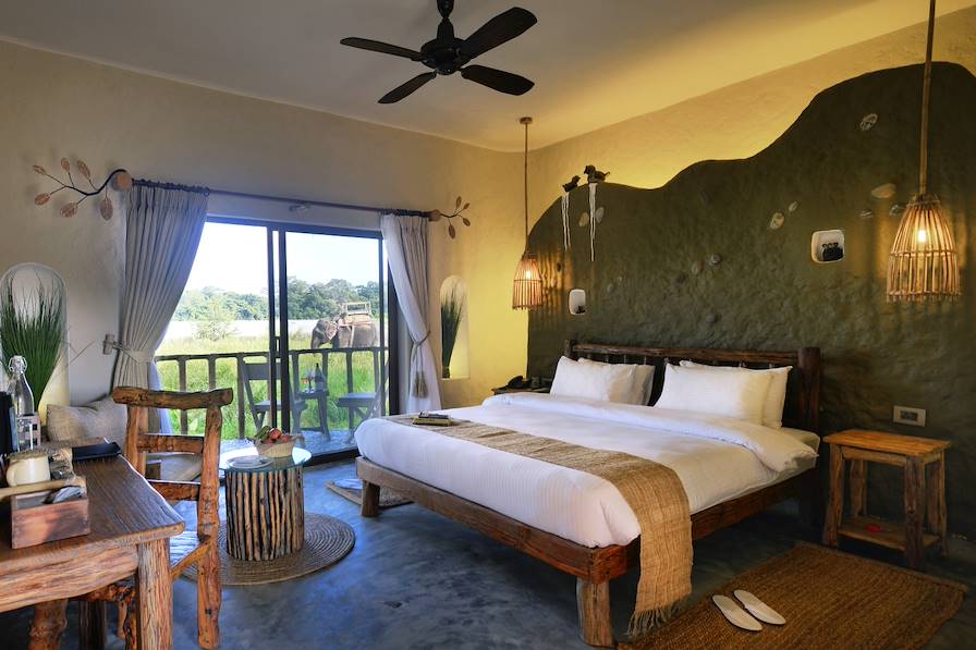 Une fois débarqué, transfert privé et installation pour deux nuits en lisière du parc national de Chitwan. Établi sur les rives de la rivière Rapti, le lodge s’intègre harmonieusement à son environnement. On dîne avec vue sur l'eau, on fait des bombes dans la gigantesque piscine ("une piscine!" entend-on s'écrier les teens) avant de regagner les chambres communicantes – chacun son intimité.