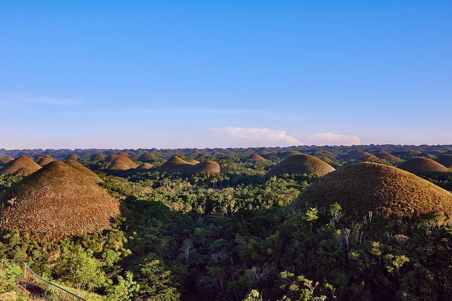 Bohol est célèbre pour ses « Chocolate Hills », inscrites au Patrimoine Mondial de l’Unesco, collines calcaires que l’érosion karstique a sculpté en cône parfaitement réguliers, verts en saison des pluies, d’un brun chocolat à la fin de la saison sèche. Le littoral est une succession de plages, de villages de pêcheurs et d’églises espagnoles.
