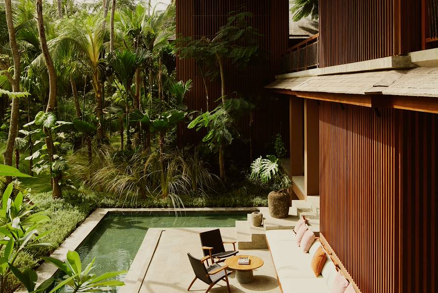 Transfert privé jusqu'aux environs d'Ubud et installation pour trois nuits au sein d'un très bel hôtel perché sur les hauteurs, surplombant la dense végétation. Ici, pas de murs ni de portes – on s'inspire de l'architecture balinaise. L'idée est de se connecter à l'essentiel. Pour autant, on ne manque absolument pas d'intimité, tous les logements étant tournés vers la nature et sept sommets majestueux se dessinant à l'horizon. Vous disposez d'une villa privative dotée de son propre bassin. La décoration est splendide : bohème, tout en bois, voilages, tapis traditionnels... Une grande terrasse offre un bel espace pour rêver, dormir, lire, pratiquer le yoga ou méditer. Au restaurant, les chefs préparent les repas sous les regards des hôtes – les plats mettant en avant le végétal et les saveurs ancestrales balinaises tout en visant le zéro déchet. Au pied de cette incroyable retraite coulent la rivière Ayung et sa vivifiante cascade.