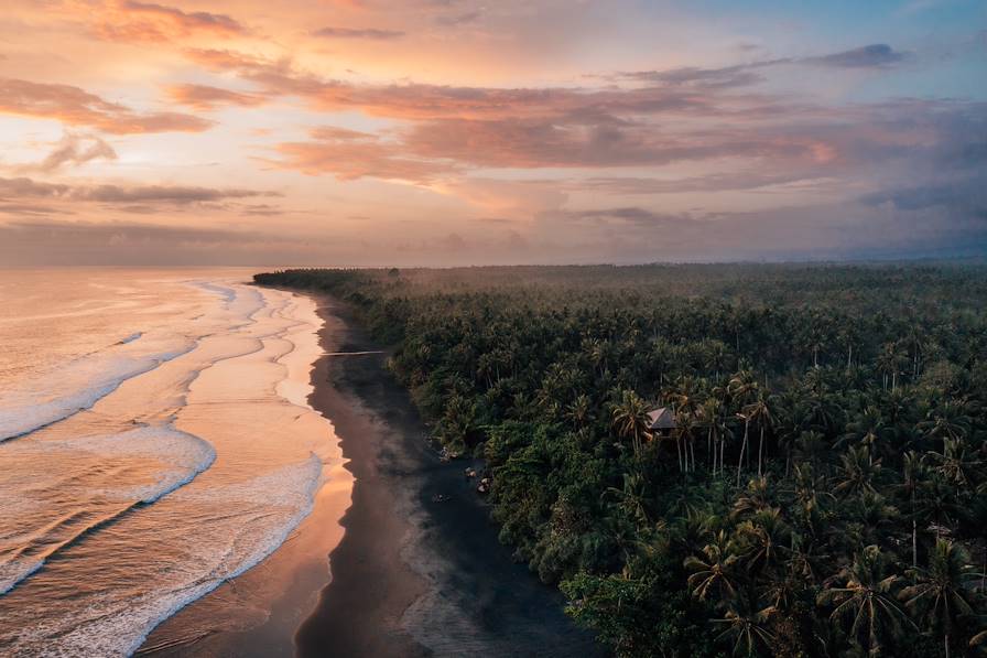 Transfert privé à l'aéroport et vol pour Denpasar. Nouveau transfert vers Pekutatan et installation pour trois nuits face à une plage de sable noir d'origine volcanique, une jungle luxuriante de palmiers en arrière-plan. Les chambres, inspirées des cabanes, sont perchées sur d’élégantes structures en bois flottant au-dessus des arbres. Au réveil, la vue sur la canopée s'accompagne du doux murmure de l’océan. Les journées ici s'enchaînent entre sessions de surf et séances de yoga au bord de la piscine. La cuisine de l'établissement honore la nature avec des saveurs locales et de saison, offrant une délicieuse interprétation végétalienne de la gastronomie balinaise. Les fruits et légumes, issus de la permaculture, y sont sublimés. Une approche écoresponsable – des panneaux solaires alimentent la propriété en énergie – complétée par une politique zéro déchet.
