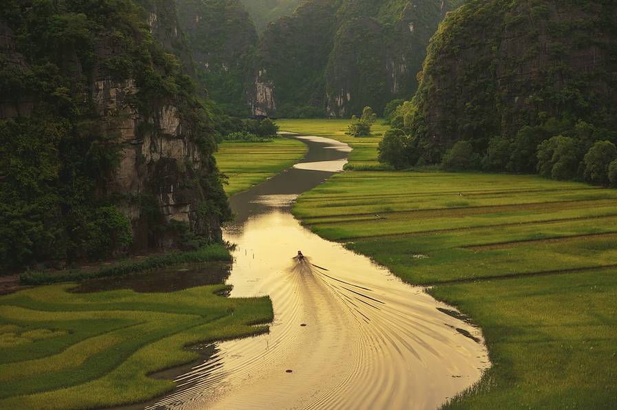 Déjà prévue - La baie d’Halong terrestre. Avec un guide francophone privé, trois étapes principales au cours de cette journée, sachant que les déplacements dans ces paysages fabuleux de rivières, pitons, buttes, dents calcaires sont un premier enchantement. On commence par l’impressionnante cathédrale catholique de Phat Diem. Le complexe, de style vietnamien, date de la fin du XIXe siècle. Viennent ensuite les pagodes de Bich Dong, fondées au XVe siècle sur le mont Ngu Nhac. Le paysage est classé au patrimoine mondial. Les grottes naturelles et les édifices, dont l’inspiration chinoise est patente, composent une harmonie apaisante. Enfin, dans un secteur tout particulièrement préservé, la réserve ornithologique de Thung Nham. Les cigognes de dressent comme des cierges au sommet des arbres ; les bihoreaux, la tête dans les épaules, attendent la bonne fortune ; le shama dayal ressemble à une petite pie.