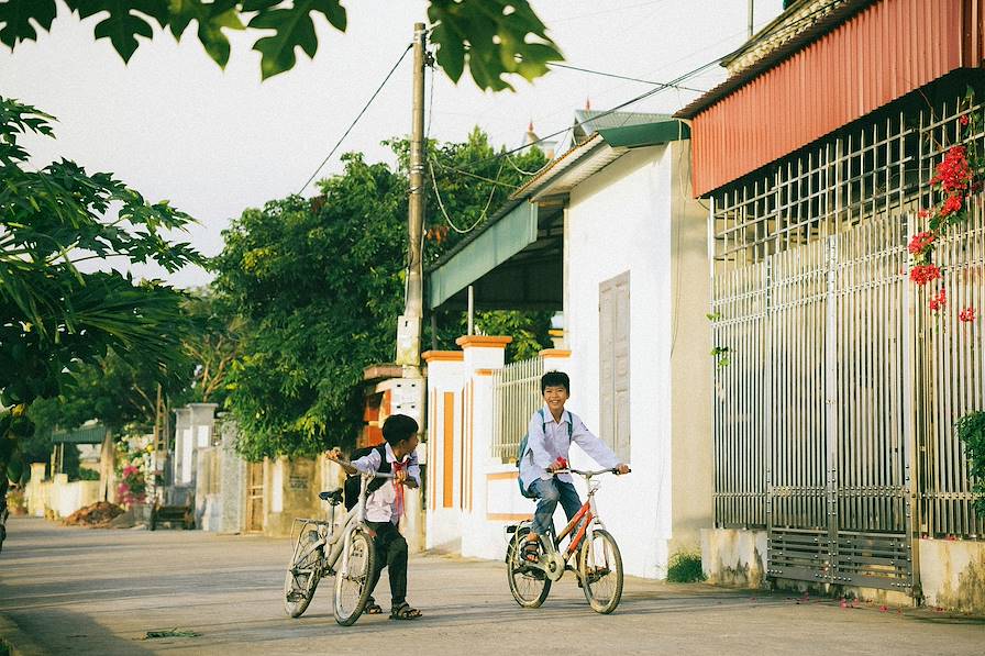 Au programme - Quatre jours dans la province septentrionale de Ha Giang. Prise de contact avec le guide francophone privé et le chauffeur. Route pour la province de Lao Cai, district de Bao Yen, village de Xuan Hoa, près de Vinh Yen. En plein Vietnam rural. Les parents de vos hôtes cultivent riz, théiers, cacahouètes, cannelle. Le petit domaine est établi sur un dévers. Emmailloté de végétation. Votre bungalow est simple et confortable. Relevé des belles photographies de Gioi, qui mène l’affaire avec sa femme Hue. En bas, une campagne toute verte et bousculée de hautes collines, où les rizières posent des miroirs. On est ailleurs. Après le déjeuner, une randonnée donne un premier aperçu du paysage époustouflant que composent les cultures en terrasses. Une telle méticulosité à ce point étendue dans l’espace et le temps confond. Grande esthétique paysanne.