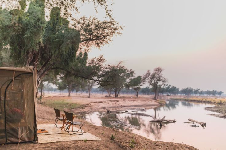 Vol pour le Lower Zambezi National Park. Installation pour deux nuits au bord de l’eau, sous le couvert d’un bois d’acacias. On vit sous la tente : simple et confortable. Le matériel est léger mais d’excellente qualité. La literie notamment. On est là à touche-touche avec la nature. C’est une expérience pour tous les sens. 100% safari. La douche se prend avec un bon vieux seau de toile. Des écrans végétaux assurent l’intimité de chacun. Des zones ombragées protègent des heures les plus éblouissantes. On peut aussi se retirer dans le lounge, propice aux boissons fraîches et aux longues conversations. Les repas sont servis dans la tente mess. Ils sont d’une qualité qui étonne dans ce coin isolé. Et une table bien dressée dans le bush est toujours source d’une satisfaction intense. Le soir, on se réunit autour du feu de camp ; sensations rustiques et apaisantes entretenues par les flammes et les étincelles.